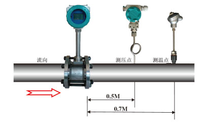 现场工况有时候用一体式涡街流量计不方便观察流量读数,此时就要用到分体式流量计。分体式涡街流量计是涡街传感器(脉冲输出)与二次显示仪表(积算仪)配套可将显示仪表用线缆拉到容易观看的环境中便于观察流量读数。分体式流量计被广泛的应用在高温高空的工作环境中。分体式涡街流量计也方便在管道上加PT100和压力变送器,轻松方便的实现温度和压力补偿。在二次显示仪表上也可显示介质的瞬时质量流量、累积质量流量,同时也可显示介质的温度和压力,可测量液体、一般气体、饱和蒸汽、过热蒸汽等。